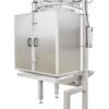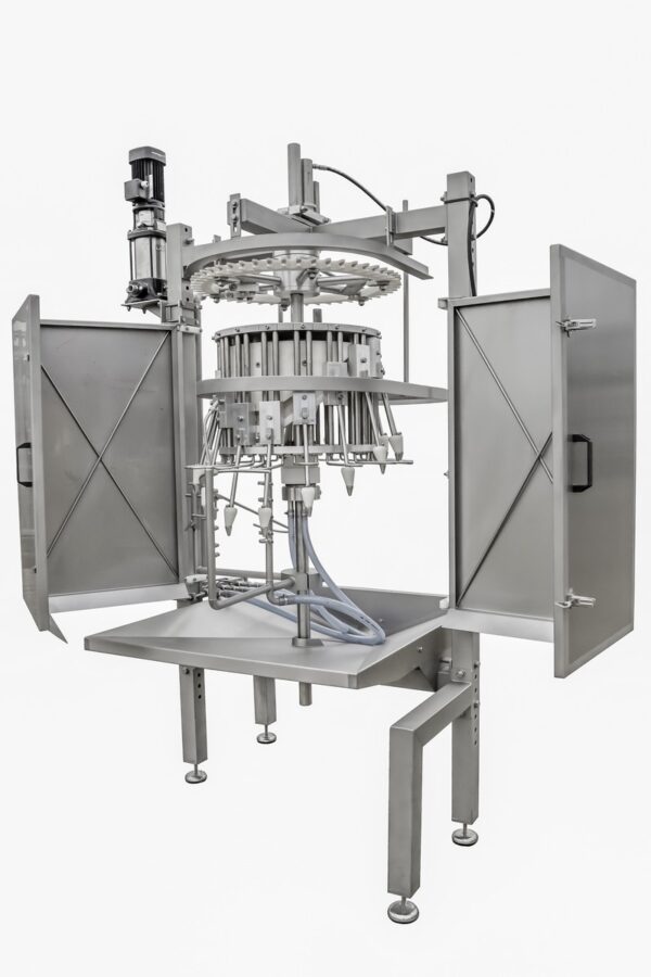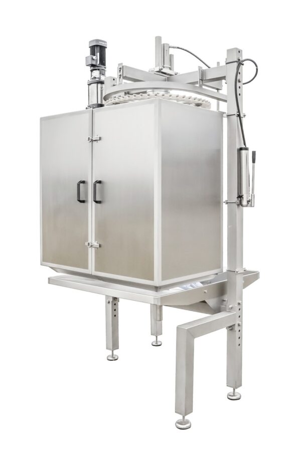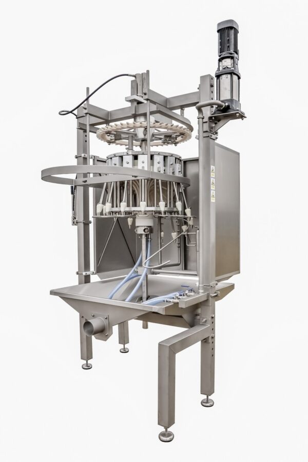 Jatočné telo sa vkladá do prístroja zavesené na päte existujúceho reťazového dopravníka a môže byť ľubovoľne umiestnené vzhľadom na vnútro prístroja: chrbát alebo prsia. Správnu polohu jatočného tela vo vzťahu k umývacím dýzam zaručuje vodidlo a chápadlo, ktoré podopiera jatočné telo. Vonkajšie umývanie je nepretržité a vnútorné umývanie sa aktivuje hneď po vložení umývacej hlavy do jatočného tela. Vnútorná umývacia hlava sa pohybuje vo vertikálnej rovine, čo umožňuje dôkladné umytie jatočného tela.