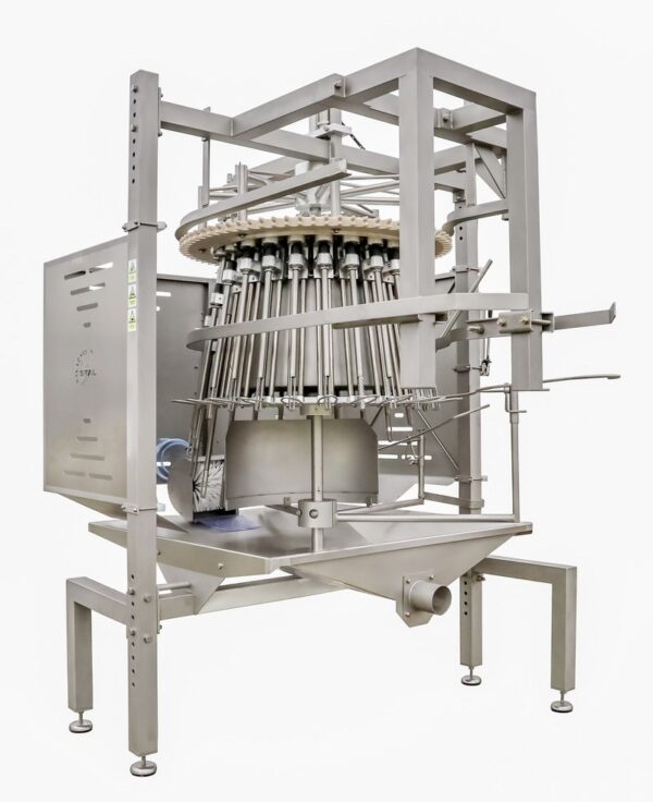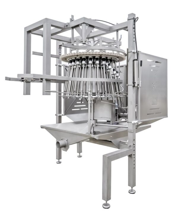 Stroj sa používa na automatické oddeľovanie jatočnej časti od kože vo vnútri kuracieho tela.