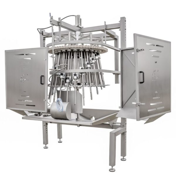 Jatočné telá sa vkladajú do stroja hrudníkom smerom von a chrbtom do stredu stroja. Vodiaca lišta umiestnená na spodnom vedení zavádza kurčatá do vedenia nôh, kde sa zaistia. Pomocou posuvného bloku sa do kurčaťa vloží čistiaca tyč. Otáčanie čistiacej tyče sa začína po jej vložení do kurčaťa a postupuje k hrdlu. Čistiaca tyč sa počas otáčania pod kurčaťom čistí kefou. Po vyčistení sa otáčanie zastaví a čistiaca tyč sa vyberie z kurčaťa.