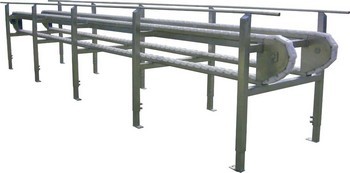 Horizontálny reťazový dopravník sa používa na prepravu kontajnerov so živou hydinou (kontajnery, v ktorých sa hydina dodáva na bitúnok).