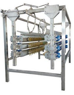 Hlavné konštrukčné prvky šklbacieho stroja sú: rám so stĺpikmi (4 ks), 3 nosníky na oboch stranách – symetricky zavesené na 2 stĺpikoch. Dva protiľahlé horné nosníky sú vybavené plochými hlavami, na ktorých sú upevnené gumené prsty. Ostatné nosníky sú vybavené priestorovými hlavami. Horizontálne nastavenie nosníkov sa vykonáva pomocou pákového systému a šnekového prevodu s elektrickým alebo ručným pohonom. Vertikálne nastavenie nosníkov namontovaných na stĺpoch sa vykonáva pomocou šnekových prevodov a vertikálneho ozubeného hrebeňa namontovaného na stĺpoch (jeden hrebeň má 3 prevody). Vták zavesený na strmeňoch sa podáva medzi rotujúcimi šklbacími kotúčmi pomocou reťazového dopravníka. Uhol sklonu tyčí a vzdialenosť gumených prstov od ošklbaného vtáka sú nastaviteľné.